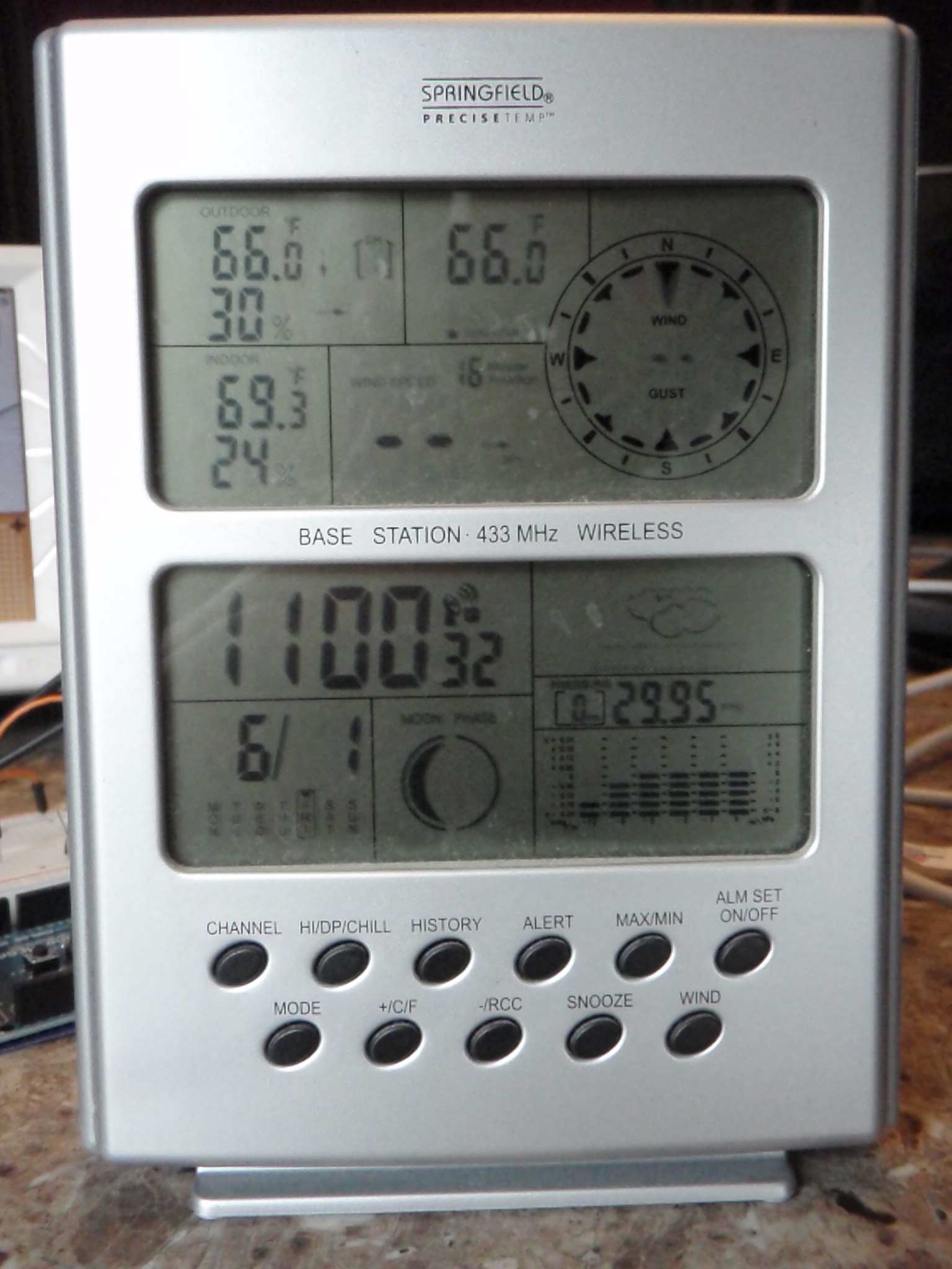 Here's the Springfield Precision #91751 atomic clock. You'll notice in the upper-left hand corner that it has a temperature and the humidity. That's the temperature I'm going after. I'm really only interested in the temperature, but since it's broadcasting humidity too, I'll tap that!