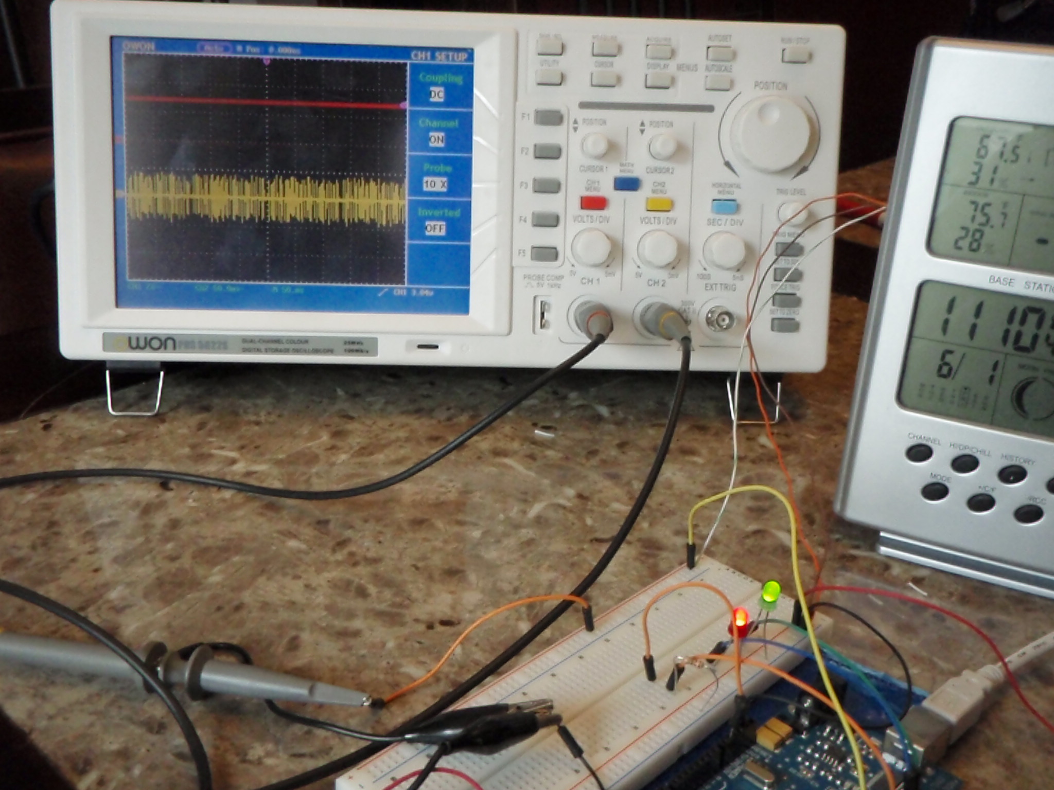 You may note that the GREEN and RED LED are active, indicating the RF receiver is on and in the Arudino program is in debug mode.